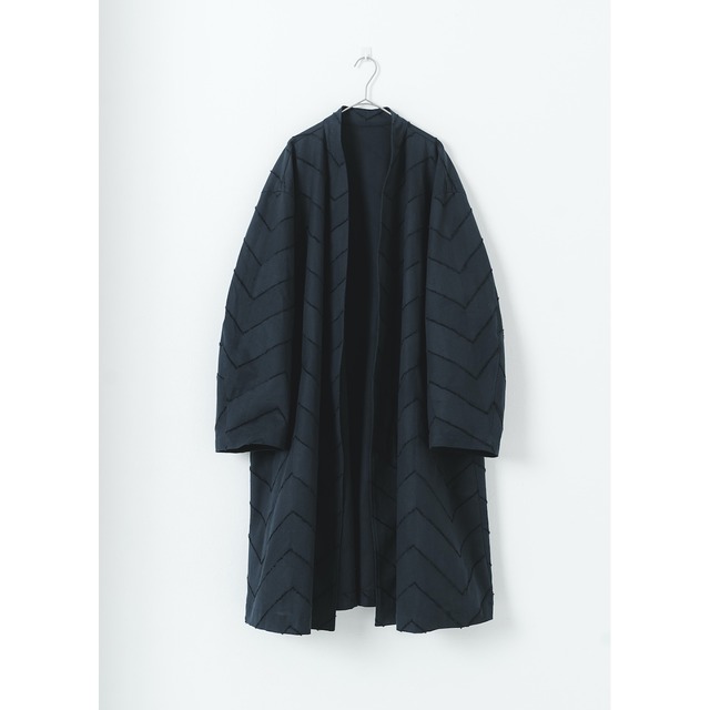 愛知・三河の伝統織物、三河木綿で作る羽織り 愛知県三河地方の伝統織物、三河木綿を使用した羽織りです。 この生地は三河の織機の特徴をよく活かした、工夫された織り方で織られています。 デザイン性が高いユニークな織り方で、日本の職人らしい探究心・アイデアから生まれました。 織り方で生地の模様を表現し、光にかざすことで矢絣のような紋様が浮かび上がる「光と風をまとう」羽織りが完成しました。 また、このようなカット加工ができる工場は、今や日本に数件しかありません。 本生地は昔から取引のある職人工場に頼み、カット加工を施してもらっています。 三河木綿は使うほど肌に馴染み、日常使いに最適な木綿です。 木綿製品のため、お届け後一度水通しをしていただくとシワなども軽減されてお召しいただけます。 ■カラー ・落ち着いたトーンが魅力の薄黒(ブラック) ・鮮やかな色味がおしゃれな瑠璃色(ブルー)をご用意しています。 ■サイズ ・サイズはゆったりとしたユニセックスのワンサイズ。 こちらのページはロング丈のページとなります。 ミドル丈はこちら:https://daimaru.theshop.jp/items/122087497 ロング:着丈121cm・バスト140cm・肩幅57cm・袖丈61cm・袖巾28cm (ミドル:着丈106cm・バスト140cm・肩幅57cm・袖丈61cm・袖巾28cm) ■仕様 ポケット2ヶ所・ベルトループ両端2ヶ所・共布ベルト付 ■素材/製造国 ・本体には三河木綿を100%使用しており、愛知県三河地方・国内縫製で丁寧に生産いたします。 天然素材の持つ優れた特性を生かし、着心地良くお召しいただけます。 ■お手入れ/取り扱い注意事項 ・手洗い可 ※詳しくは商品に付いている洗濯表示をご覧ください 型崩れ防止のため、軽めの脱水を行ってください。 陰干しで自然乾燥し、アイロンは当て布をして低温で優しくかけてください。 ■発送・注文に関する情報や注意事項 ・ご注文確定後、通常2~3営業日以内に発送いたします。 なお、在庫状況により発送までに時間を要する場合がございますので、あらかじめご了承ください。 ■その他の情報や注意事項 ・色合いについて、お使いのモニターによっては実際の色と異なる場合があります。 ご不明な点やご質問がありましたら、ショップのお問い合わせからお気軽にご連絡ください。