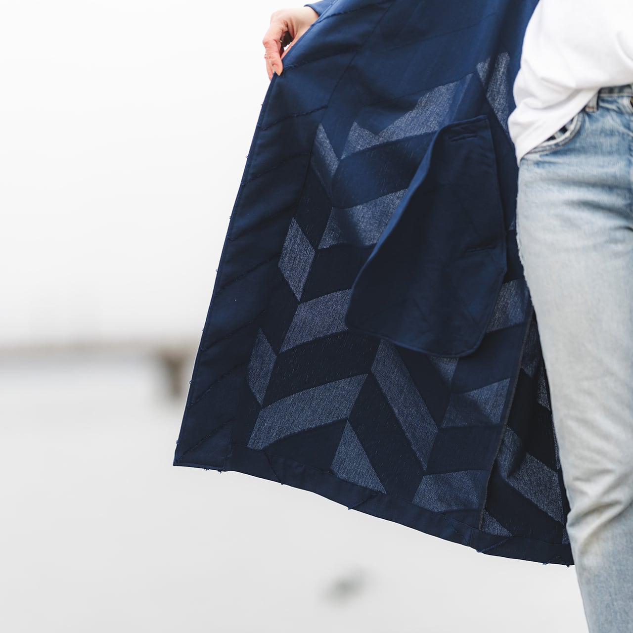 織り方で生地の模様を表現し、光にかざすことで矢絣のような紋様が浮かび上がる「光と風をまとう」羽織りが完成しました。