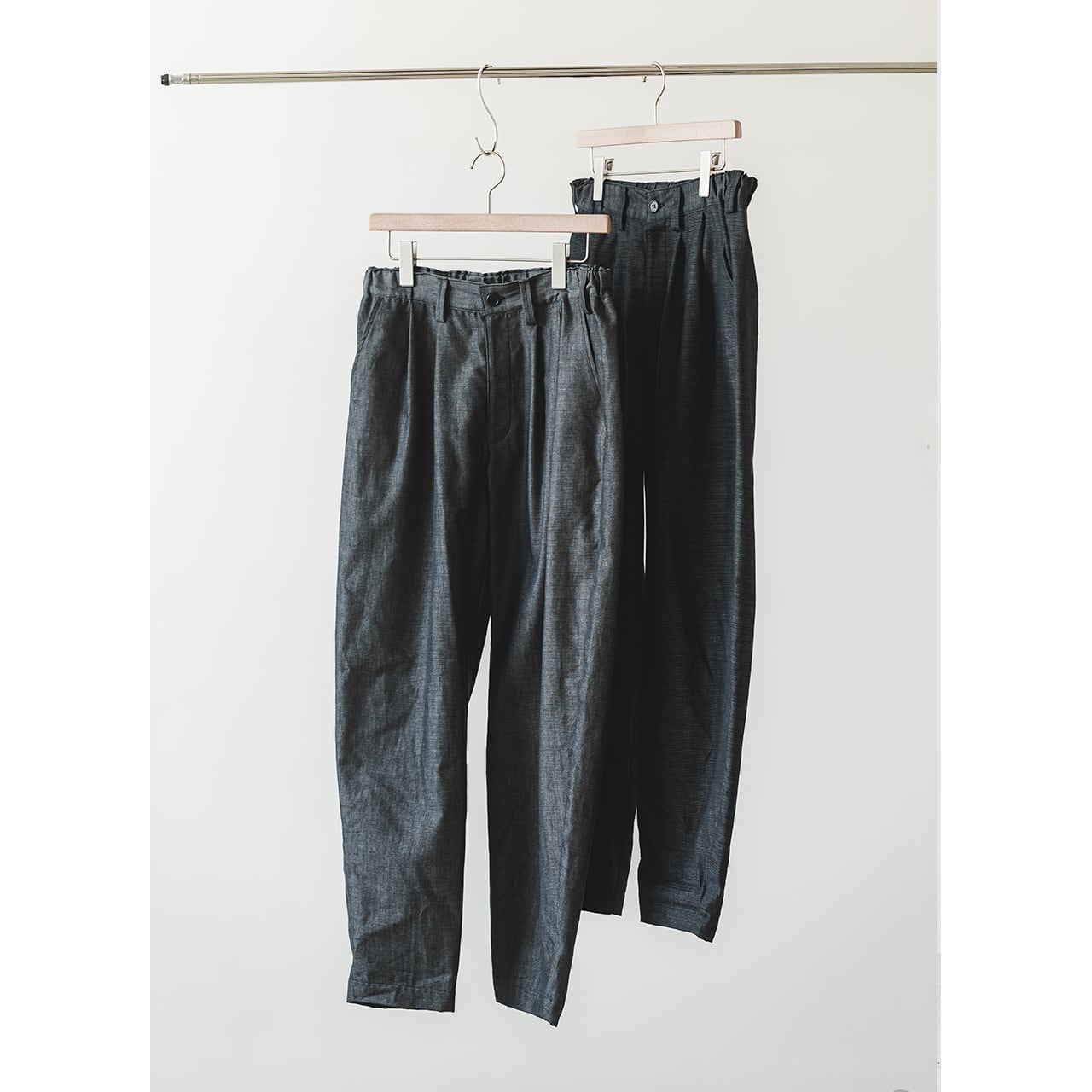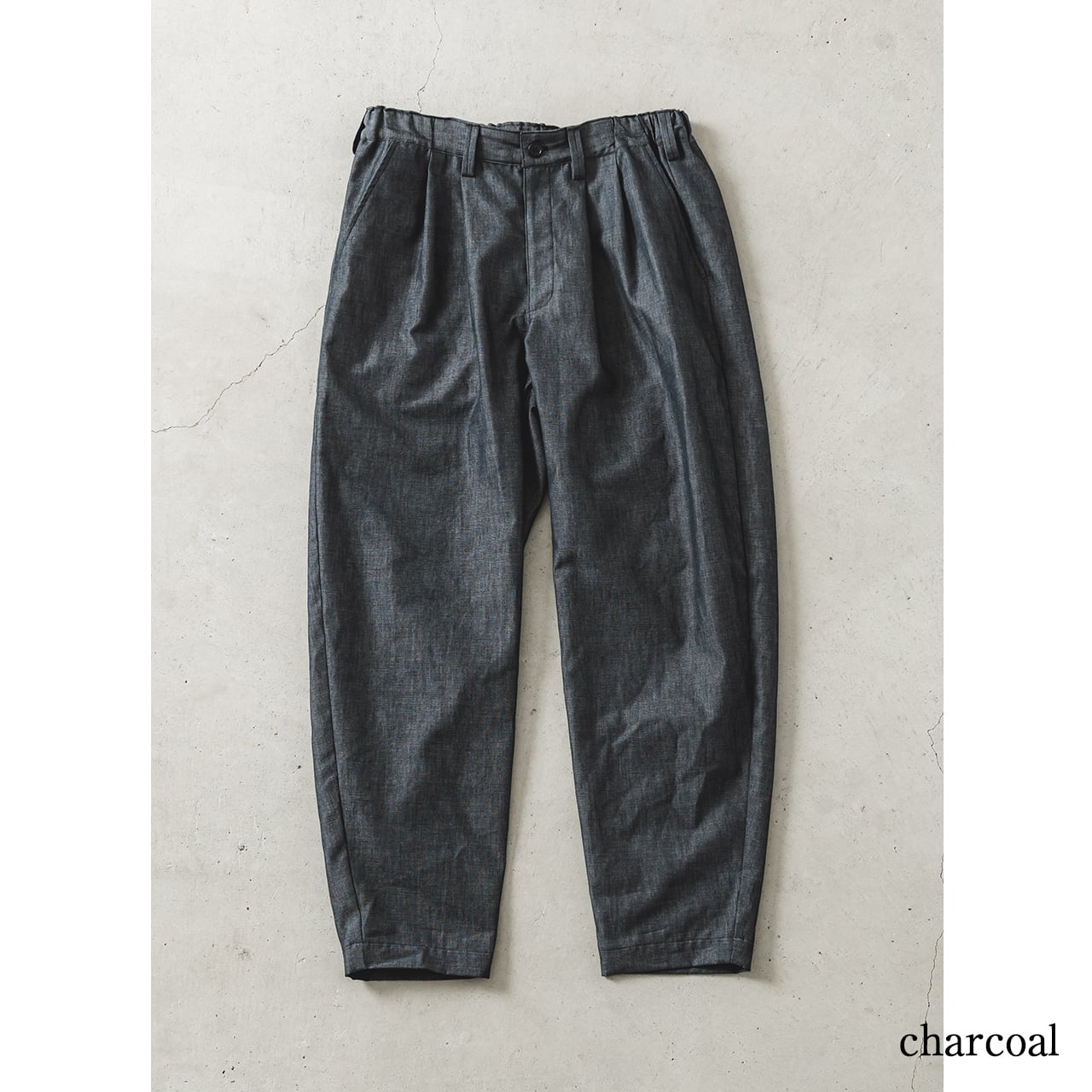愛知県三河地方の伝統織物、三河木綿を使用したテーパードパンツです。