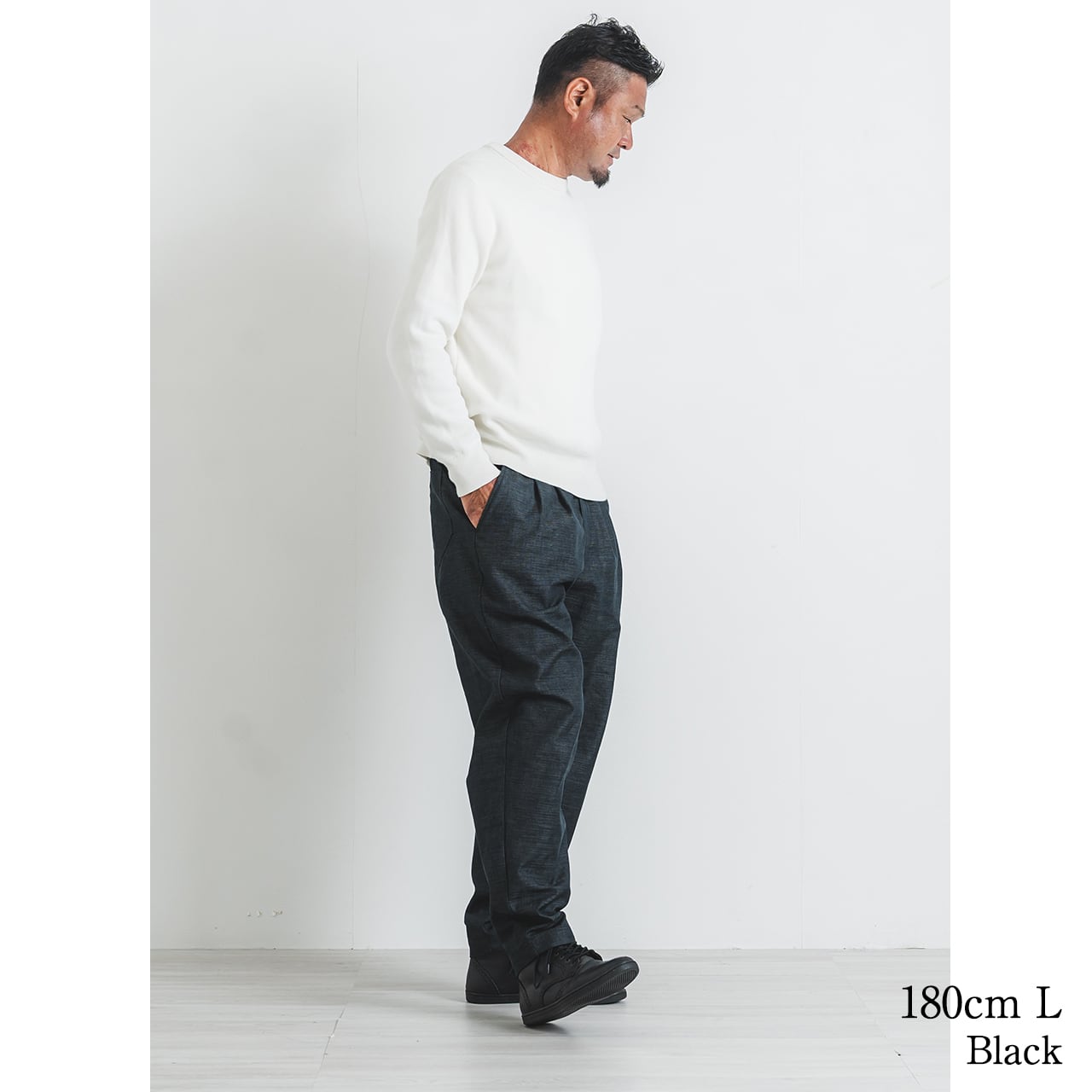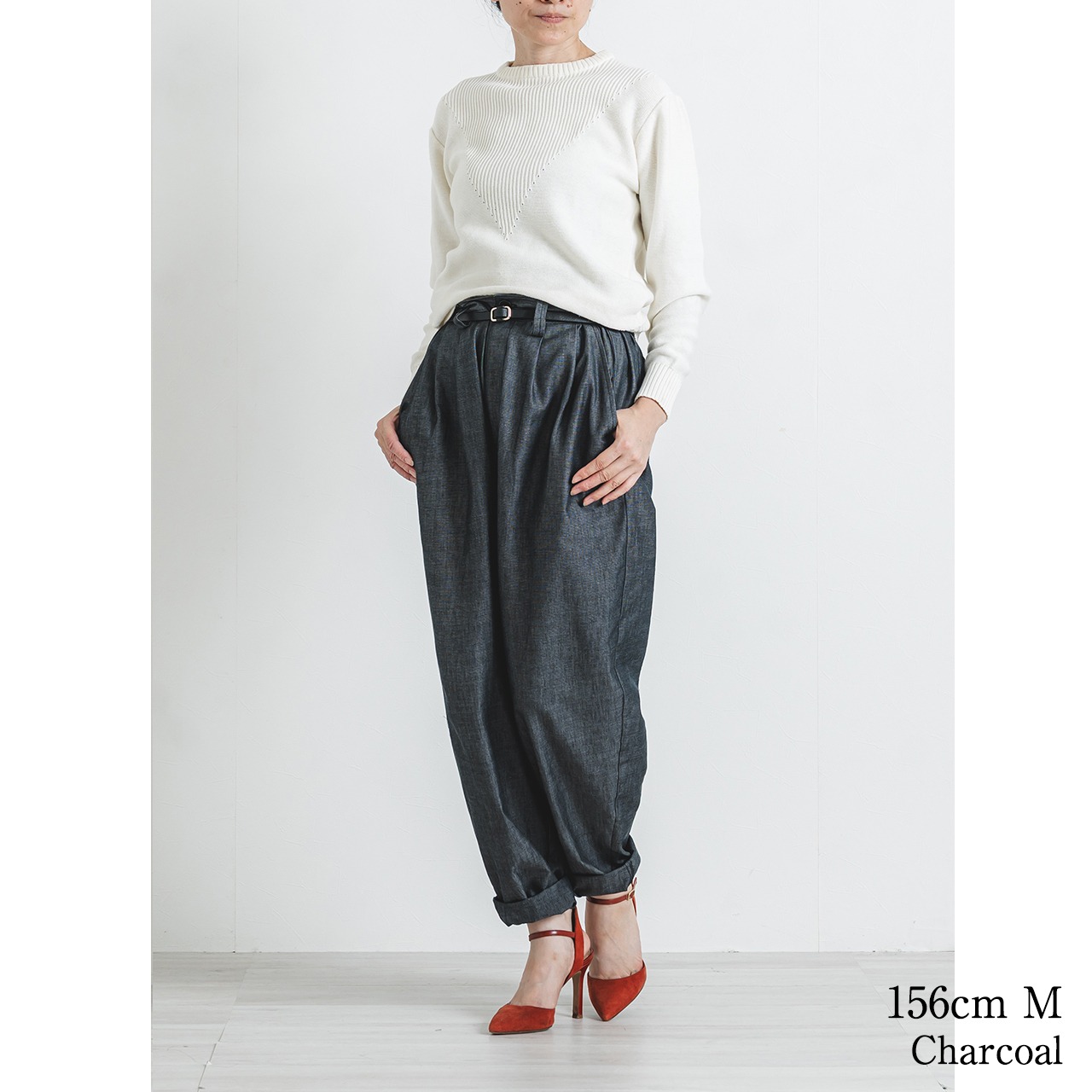 着用モデル156cm Mサイズは、裾を折って着用しています。